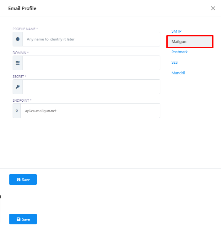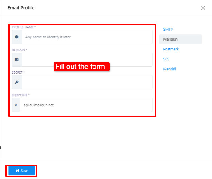 - بعد ملء المعلومات المطلوبة، انقر فوق الزر "حفظ" لإنهاء إعداد ملف تعريف Mailgun الخاص بك.