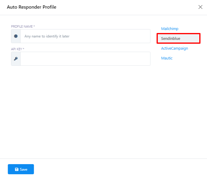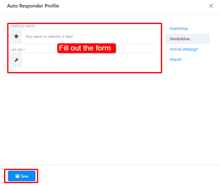 - بعد ملء المعلومات المطلوبة، انقر فوق الزر "حفظ" لإنهاء إعداد ملف تعريف Sendinblue الخاص بك.