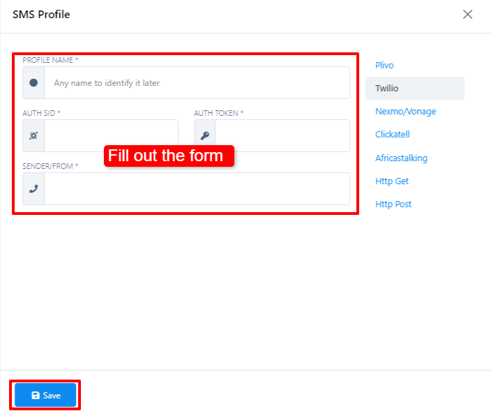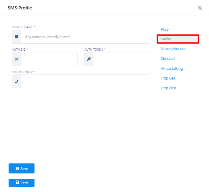 - بعد ملء المعلومات المطلوبة، انقر فوق الزر "حفظ" لإنهاء إعداد ملف تعريف Twilio الخاص بك.