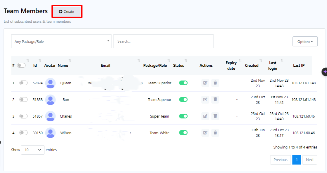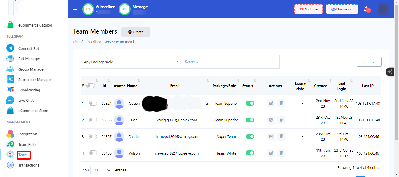 على منصتنا، عضو الفريق هو أكثر من مجرد مستخدم. إنهم أفراد متخصصون لديهم إمكانية الوصول إلى مجموعة متنوعة من الميزات مثل الدردشة المباشرة وإدارة المشتركين. يعد هذا الدور مفيدًا بشكل خاص عندما يكون لديك عدد كبير من المستخدمين المسجلين وتحتاج إلى المساعدة في إدارة بياناتهم أو المهام الأخرى المتعلقة بالمستخدم.