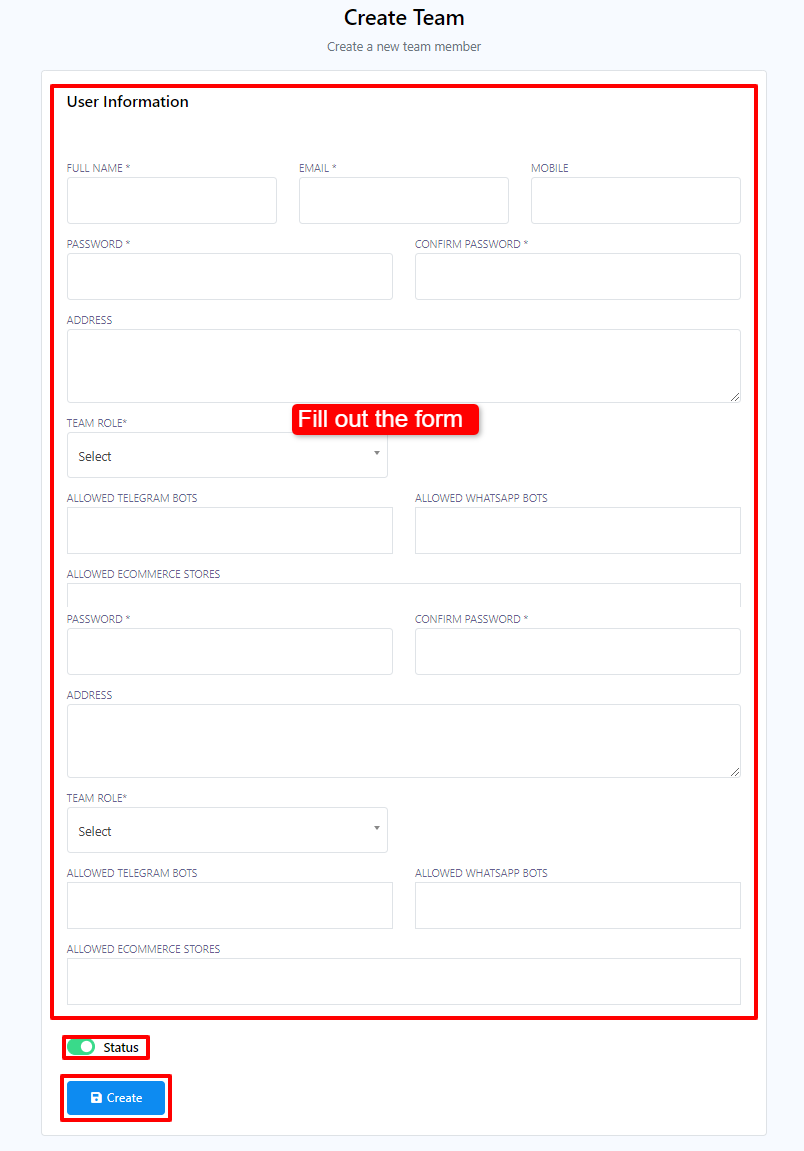 - قم بتعبئة نموذج معلومات المستخدم. أدخل اسمك الكامل، والبريد الإلكتروني، والهاتف المحمول، وكلمة المرور، والعنوان، ودور الفريق، وروبوتات التليجرام المسموح بها، وروبوتات WhatsApp المسموح بها، ومتاجر التجارة الإلكترونية المسموح بها.