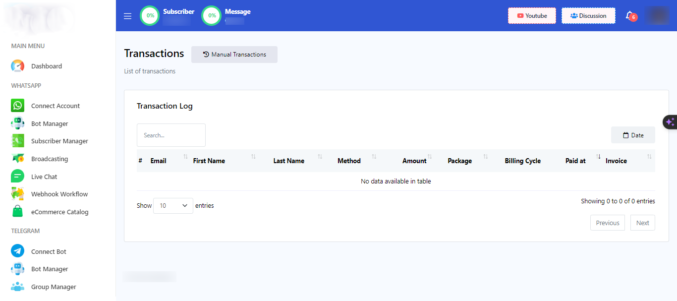 المعاملات في منصة روبوتات الدردشة الخاصة بنا، نوفر قسمًا مخصصًا لـ "المعاملات" يمكّن المستخدمين من الإشراف والتحكم بكفاءة في معاملاتهم التاريخية والمعلقة. تم تصميم هذه الميزة الشاملة ليس فقط لتلبية المعاملات التي تتم من خلال برنامج الدردشة الآلي الخاص بنا ولكن أيضًا تلك التي تنشأ من قنوات مختلفة، مثل موقعنا الإلكتروني وتطبيق الهاتف المحمول