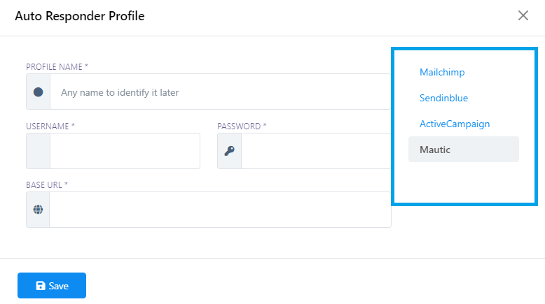 ستجد ضمن هذا القسم حقولًا متنوعة لتكوين قوائم محددة، بما في ذلك "قائمة Mailchimp"، و"قائمة Sendinblue"، و"قائمة Activecampaign"، و"Mautic List"، و"Acelle List". تسمح لك هذه الحقول بتحديد المكان الذي يجب تخزين عناوين البريد الإلكتروني المجمعة فيه بناءً على خدمة الرد الآلي التي اخترتها.