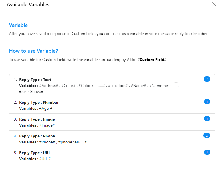 المتغيرات المخصصة: ضمن قائمة "الخيارات"، ستجد إرشادات حول كيفية استخدام المتغيرات المخصصة وقائمة بالمتغيرات المخصصة المتاحة لراحتك.