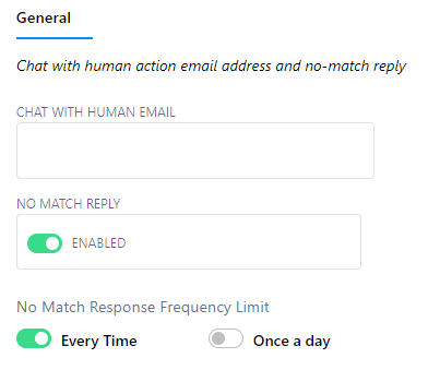 إن حد تكرار الرد بعدم التطابق لحساب الروبوت هو الحد الأقصى لعدد المرات التي يمكن أن يستجيب فيها برنامج الدردشة الآلي برد "لا يوجد قالب مطابق". في هذه الحالة، إذا كان زر التبديل "في كل مرة" قيد التشغيل، فسيرسل برنامج الدردشة الآلي "قالب لا يوجد تطابق" في كل مرة لا يتمكن فيها من تحديد الاستجابة المناسبة. وفي الحالة الأخرى، إذا تم تحديد زر التبديل "مرة واحدة يوميًا"، فسيرسل برنامج الدردشة الآلي "قالب لا يوجد تطابق" مرة واحدة فقط يوميًا إذا لم يتمكن من مطابقة أي ردود روبوت.
