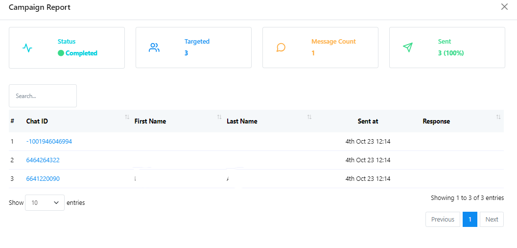 - يمكنك التحقق من الحالة والعدد المستهدف للمشتركين وعدد الرسائل والتقرير المرسل هنا.