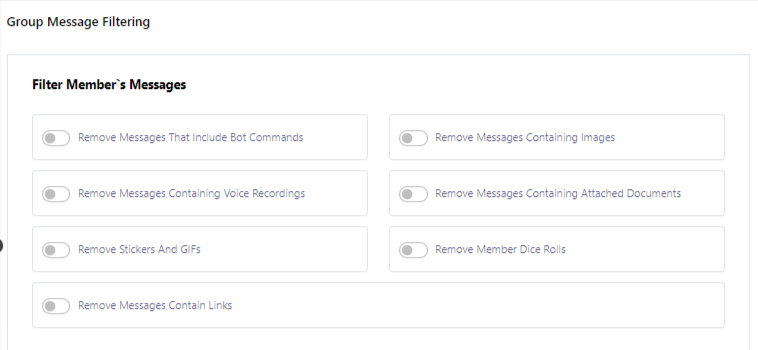 - إزالة لفات نرد الأعضاء: قم بتصفية وإزالة الرسائل التي تحتوي على لفات نرد من أعضاء المجموعة، مما يقلل من المحتوى غير المرغوب فيه والمحتوى غير المرغوب فيه.