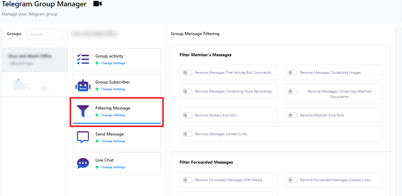 يلعب هذا القسم دورًا محوريًا في إدارة المجموعة، والمساعدة في تنظيم الأعضاء وتسهيل تصفية الرسائل داخل مجموعتك. لديك القدرة على تصفية الرسائل الواردة من أعضاء المجموعة باستخدام خيارات مثل "تصفية رسائل الأعضاء"، "تصفية الرسائل المعاد توجيهها"، "مراقبة الكلمات الرئيسية"، "رسائل المشرف التي تمت تصفيتها"، "رسائل الخدمة"، "قيود الأعضاء الجديدة"، و"حدود رسائل الأعضاء".
