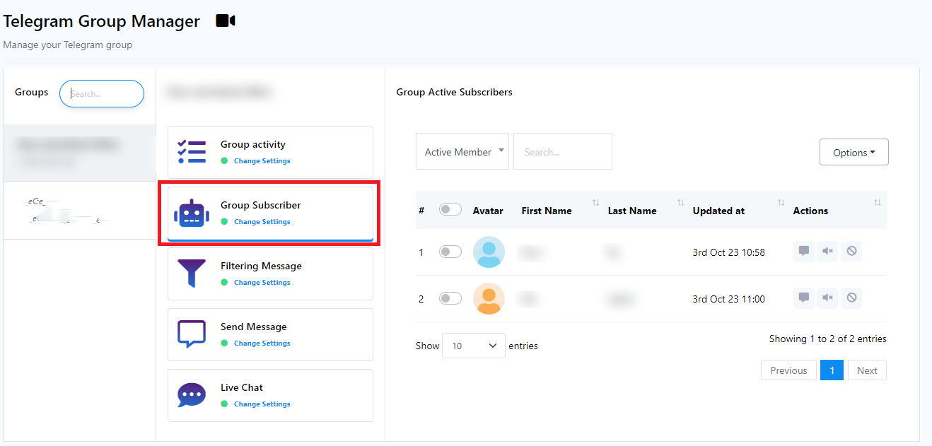 المشتركون النشطون في المجموعة: ضمن قسم المشتركين النشطين في المجموعة، ستجد قائمة شاملة تحتوي على تفاصيل جميع الأعضاء المشاركين بنشاط في المجموعة. توفر هذه القائمة رؤى قيمة حول عضوية مجموعتك.