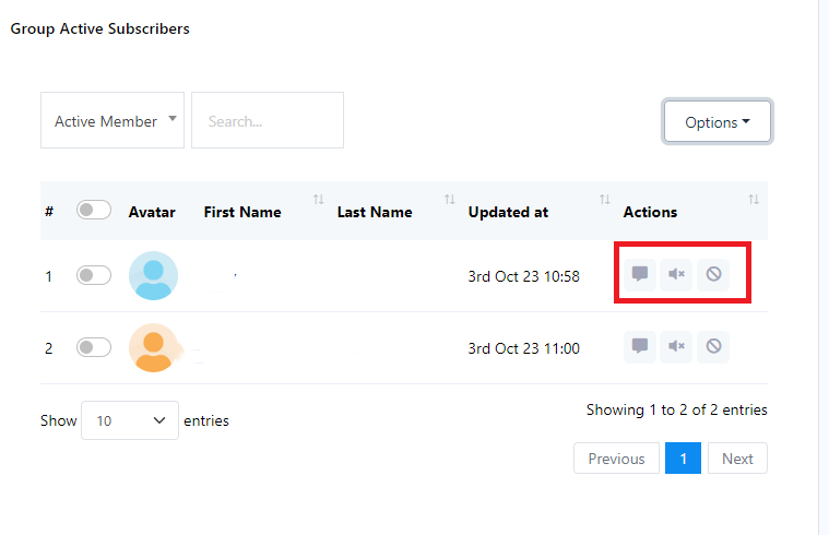 بعد ذلك، ستجد قائمة بأعضاء مجموعتك. يمكنك تخصيص عدد الأعضاء المعروضين باستخدام خيار "إظهار الإدخالات" والتنقل عبر القائمة باستخدام زري الصفحة السابقة والتالية.