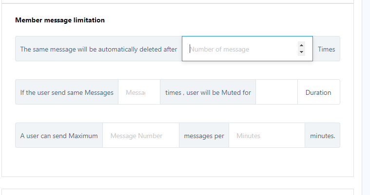 حدود رسائل الأعضاء: تسمح لك هذه الميزة بتكوين الحذف التلقائي للرسائل المتكررة بعد عدد محدد من الاستخدامات. بالإضافة إلى ذلك، يمكنك إعداد وظيفة كتم الصوت تلقائيًا للمستخدمين الذين يرسلون نفس الرسالة بشكل مفرط، مع إمكانية تحديد مدة كتم الصوت هذه.