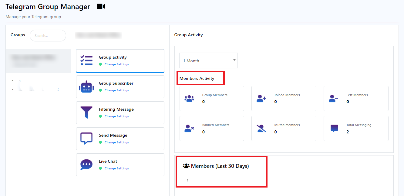- الأعضاء المحظورون: يعكس عدد الأعضاء الذين تم حظرهم من المجموعة.