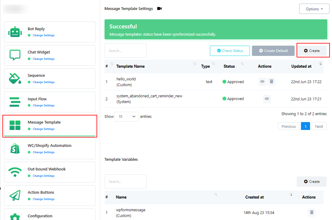 يوجد أيضًا زر "إنشاء افتراضي". من خلال النقر على هذا الزر، يمكن إنشاء 4 قوالب افتراضية لحالة الطلب والتحقق من طلب COD واسترداد عربة التسوق المهجورة واسترداد عربة التسوق المهجورة باستخدام قوالب القسيمة. قبل استخدامها، يجب الموافقة عليها أيضًا بواسطة WhatsApp.