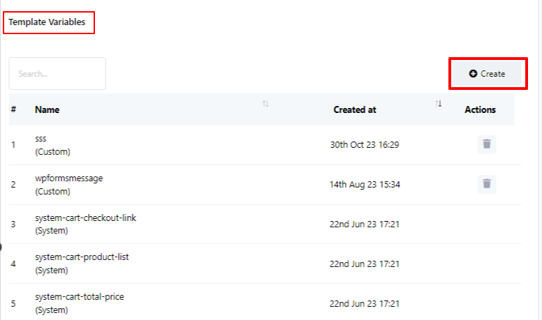 لديك خيار استخدام متغيرات القالب من قسم "متغير القالب". بالإضافة إلى ذلك، إذا كنت بحاجة إلى إنشاء متغير جديد، فيمكنك القيام بذلك عن طريق النقر فوق الزر "إنشاء" داخل قسم "متغير القالب".