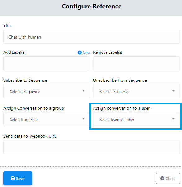 - إذا لزم الأمر، يمكنك تعيين محادثة لمستخدم معين عن طريق تحديد `بدء تدفق الروبوت`> `تعيين محادثة لمستخدم`. يؤدي هذا إلى تعيين وكيل للمحادثة الذي سيتواصل مع المستخدم عند تشغيل "الدردشة مع الإنسان".
