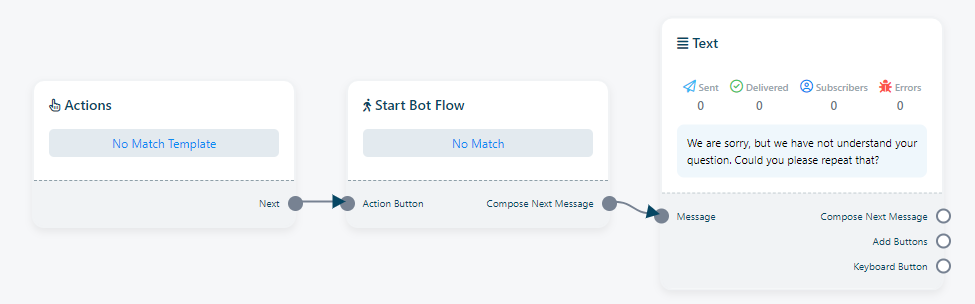 قالب عدم التطابق: يعمل "قالب عدم التطابق" كاستجابة أو رسالة محددة مسبقًا يتم تسليمها عندما يواجه الروبوت مدخلات أو استعلامات من المستخدم لا يمكنه فهمها أو معالجتها بشكل فعال. يعد هذا القالب مفيدًا للتعامل مع المواقف التي يتلقى فيها الروبوت رسائل مستخدم لا تتوافق مع أي أهداف أو أوامر محددة مسبقًا. يمكن للمستخدمين تخصيص استجابة الروبوت "لا يوجد تطابق" من خلال النقر على "لا يوجد تطابق" لتخصيص رد الروبوت وفقًا لمثل هذه المواقف.