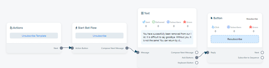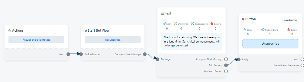 إعادة الاشتراك: يشير `إعادة الاشتراك` إلى العملية التي يقرر فيها المستخدم الذي ألغى اشتراكه مسبقًا في تلقي الرسائل أو الإشعارات من الروبوت الاشتراك مرة أخرى أو استئناف تفاعله مع الروبوت. تلعب هذه الميزة دورًا مهمًا في الحفاظ على تفاعل المستخدم وتمنح المستخدمين المرونة اللازمة لإعادة التفاعل مع برنامج الدردشة الآلي في حالة تغيير رأيهم.