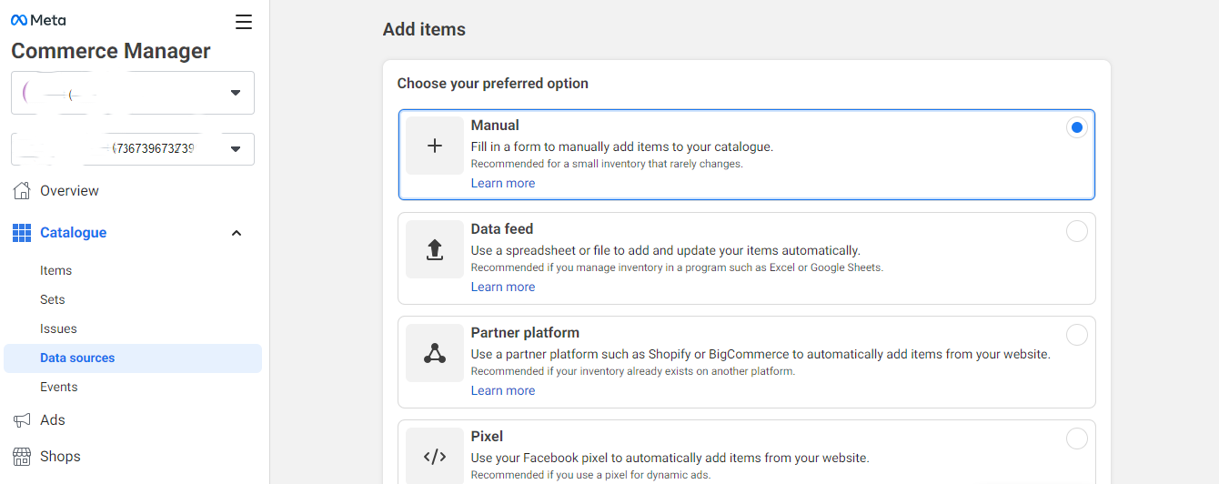 - اختر طريقة التحميل (تحميل معلومات المنتج أو الاتصال بمنصة شريكة). في الوقت الحالي، حدد تحميل معلومات المنتج.
