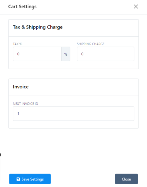 - قم بتكوين إعدادات سلة التسوق، بما في ذلك النسبة المئوية للضريبة ورسوم الشحن.